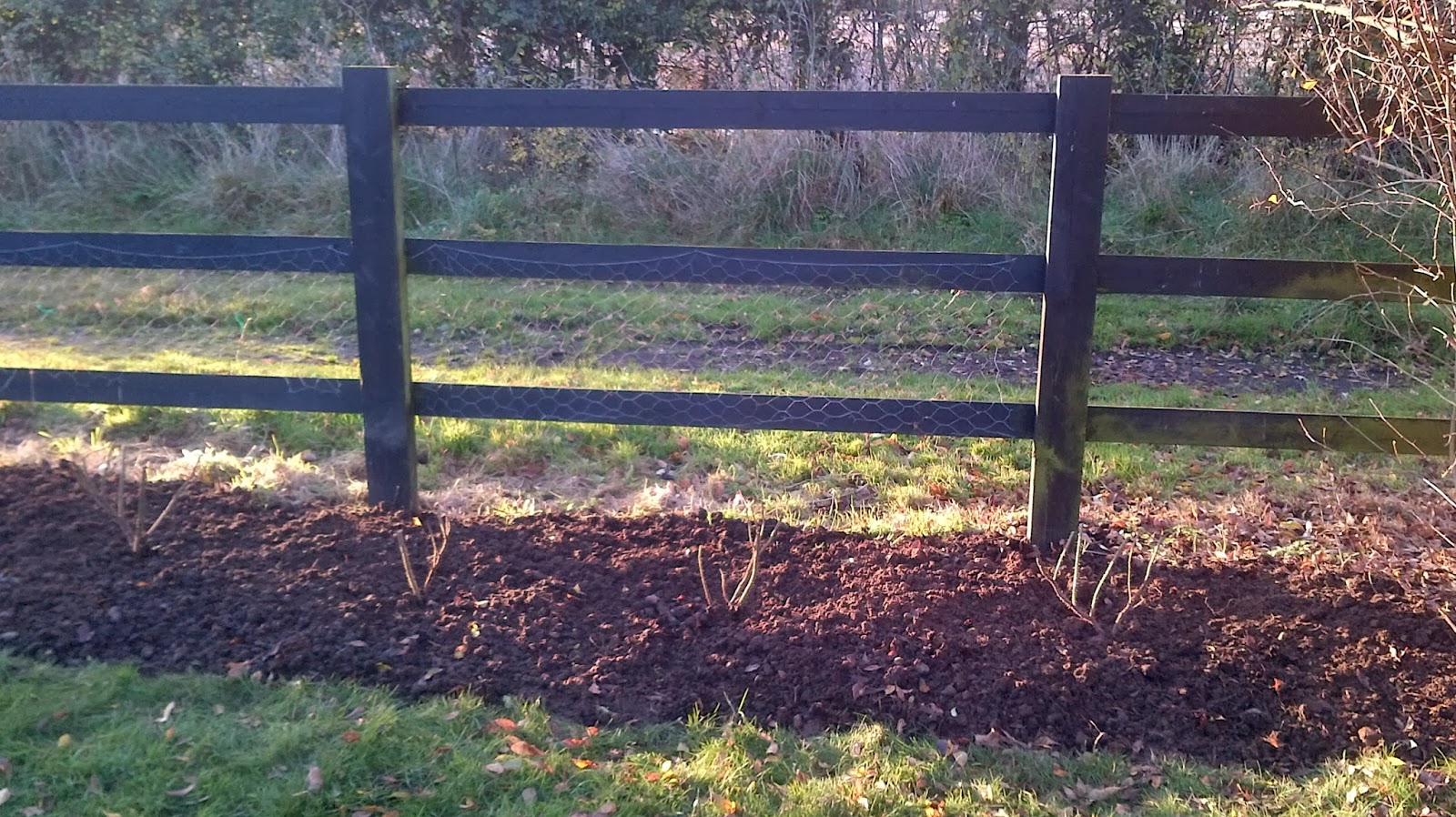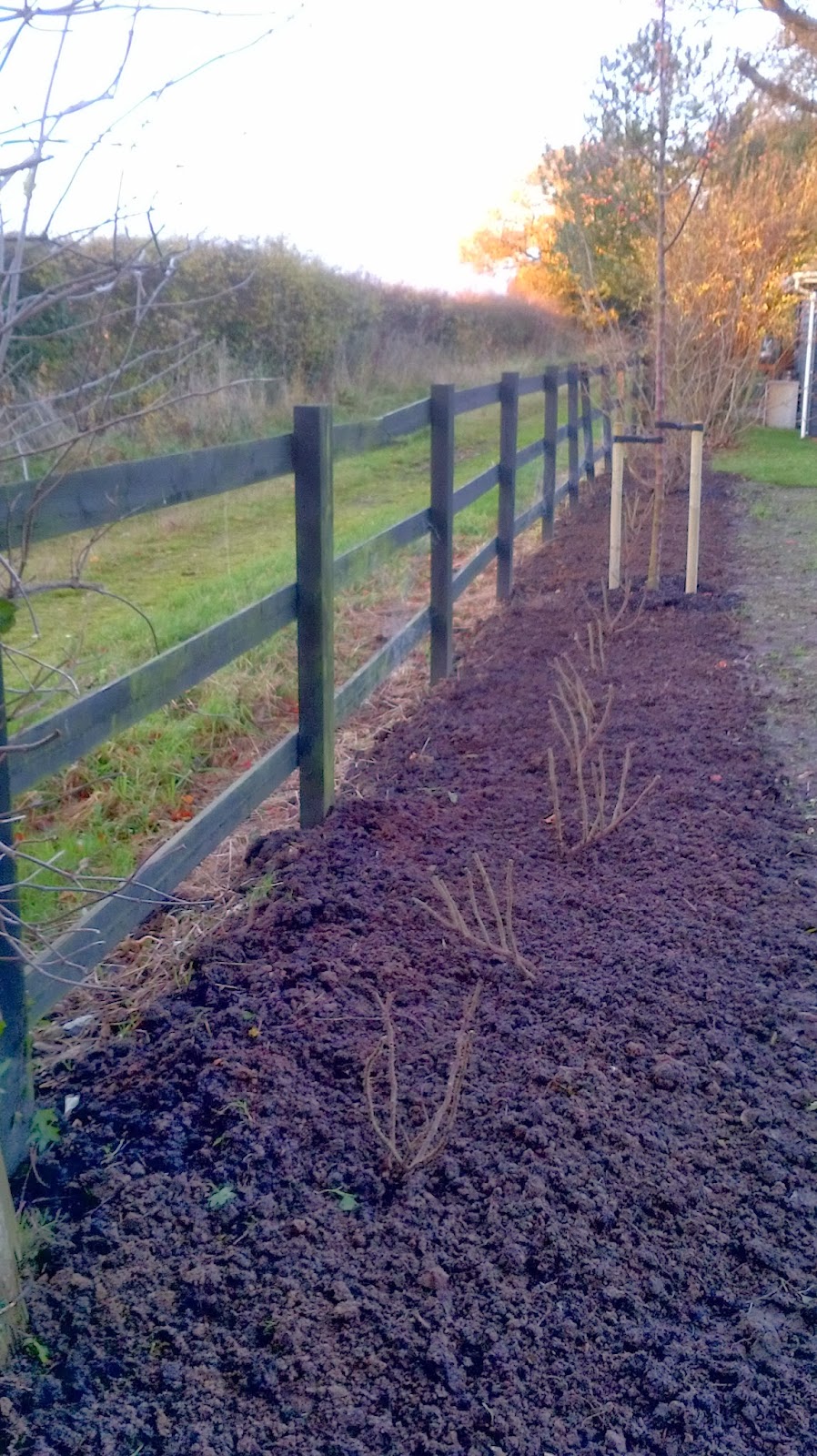 Now is the time to plant bare root roses - from November through to the end of March is the rose's dormant season. On a chilly but sunny day it's very good exercise! I have just planted 22 bare root Wild Edric roses from David Austin Roses to make an attractive and scented hedge in front of a post and rail fence: