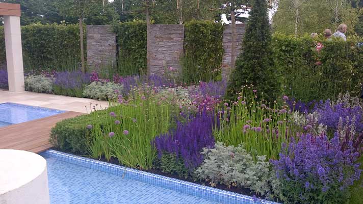 Jack's first show garden design was at the Malvern Show when he was 14 and there have been many more. He combines a love of contemporary materials and cutting edge design with an obvious passion for plants. His design 'The Italian Job' at Hampton Court Palace Flower Show in 2012 was a geometric design with straight lines, formal pleached hornbeam trees and clipped box but softened with a planting palette of purples, blues and pinks teamed with silvery foliage.